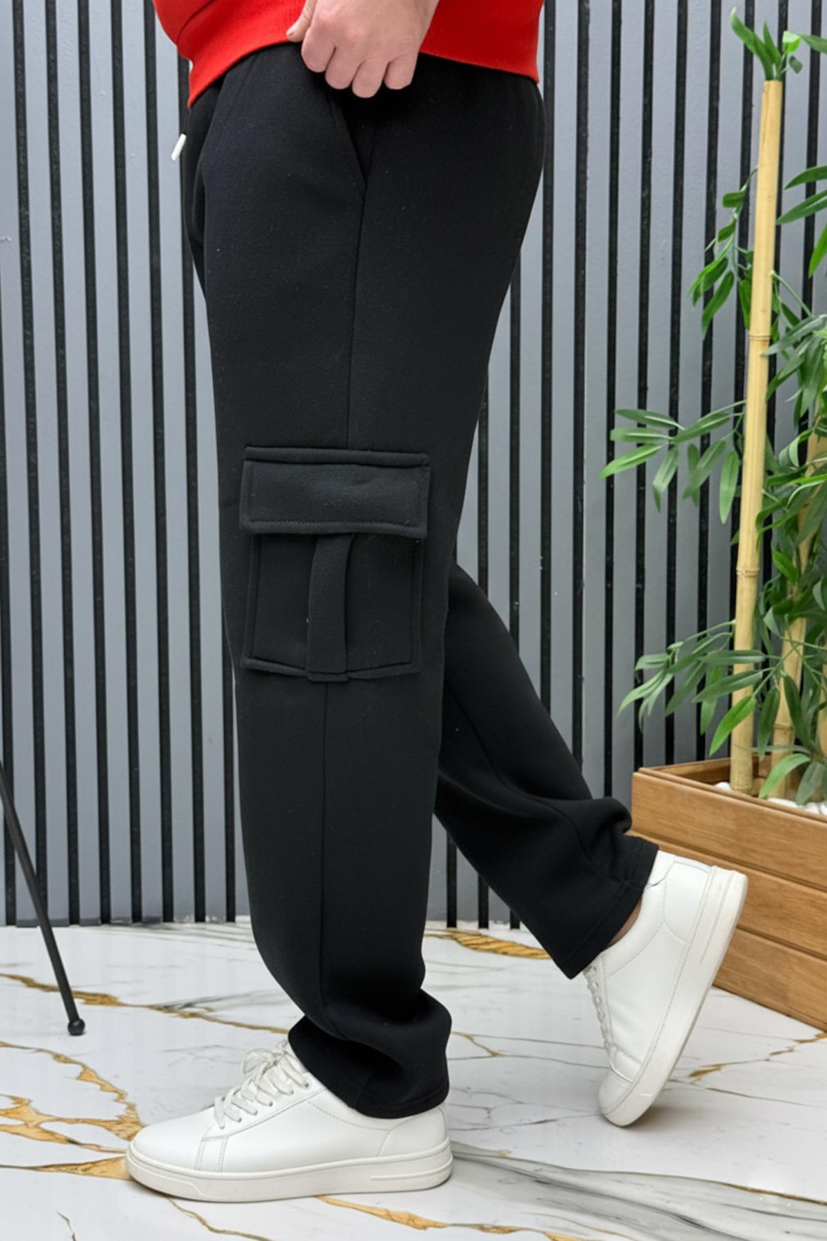 Erkek 3 İplik Şardonlu Kargo Cep Baggy Eşofman Altı - Siyah