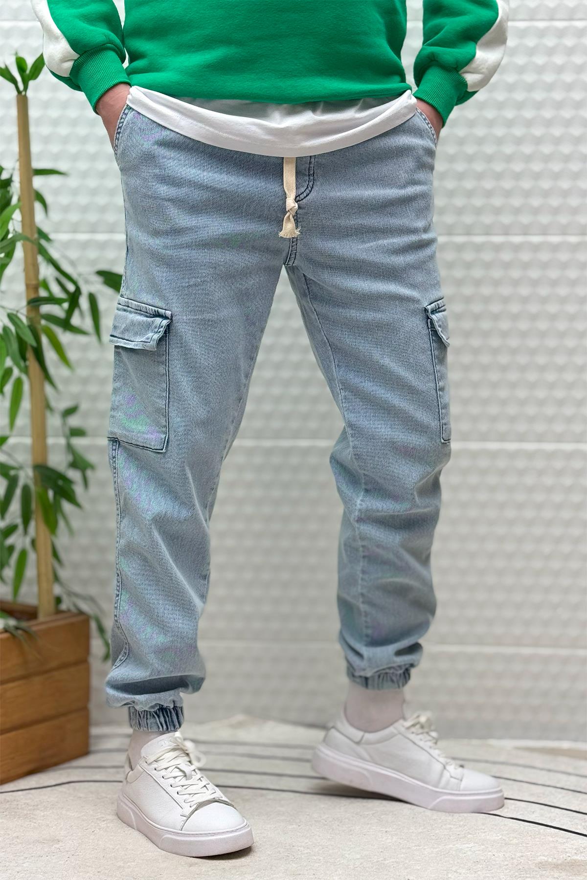 Erkek Boy Friend Kot Pantolon Kargo Cepli Bel Ve Paça Lastikli - Açık Mavi