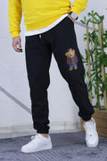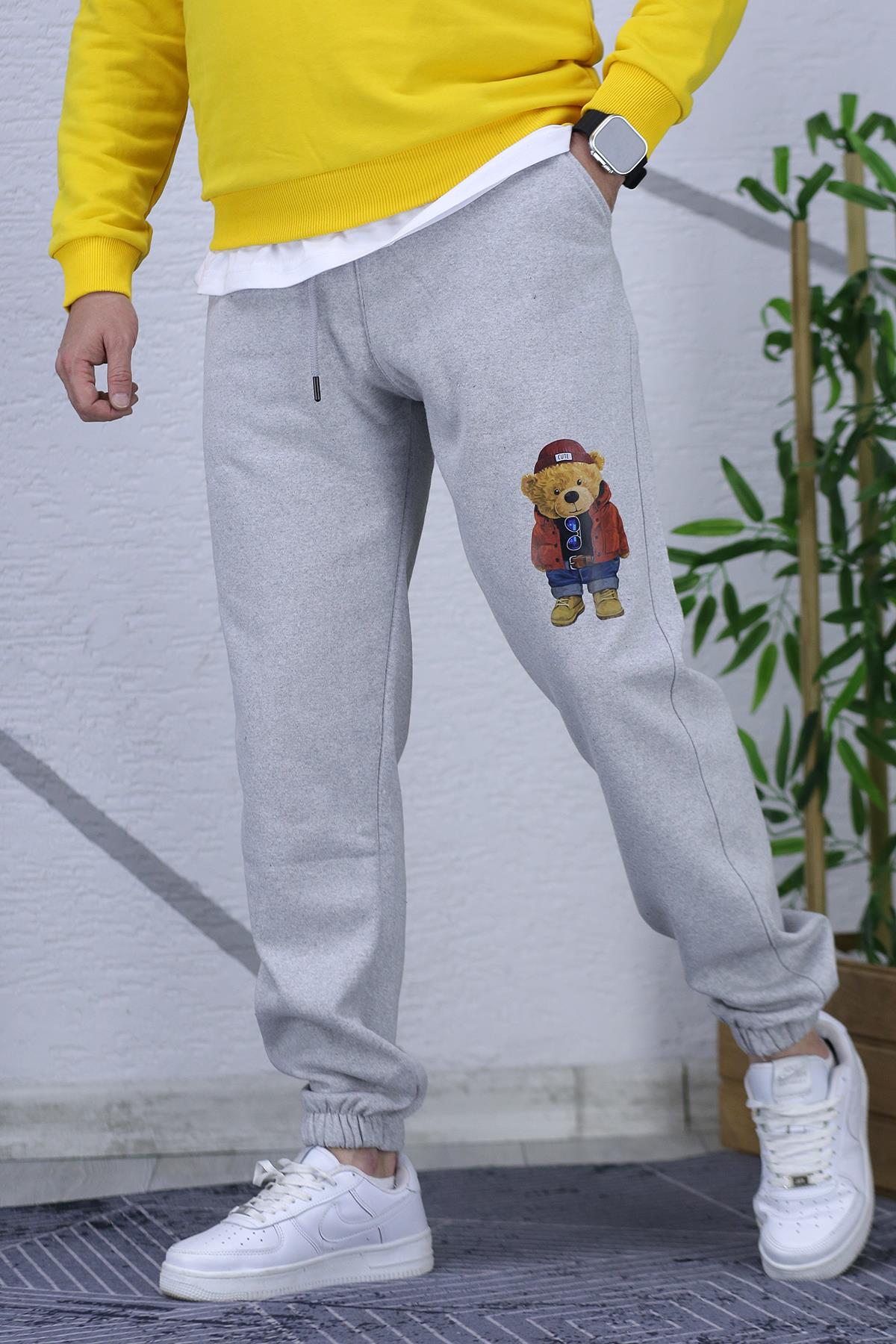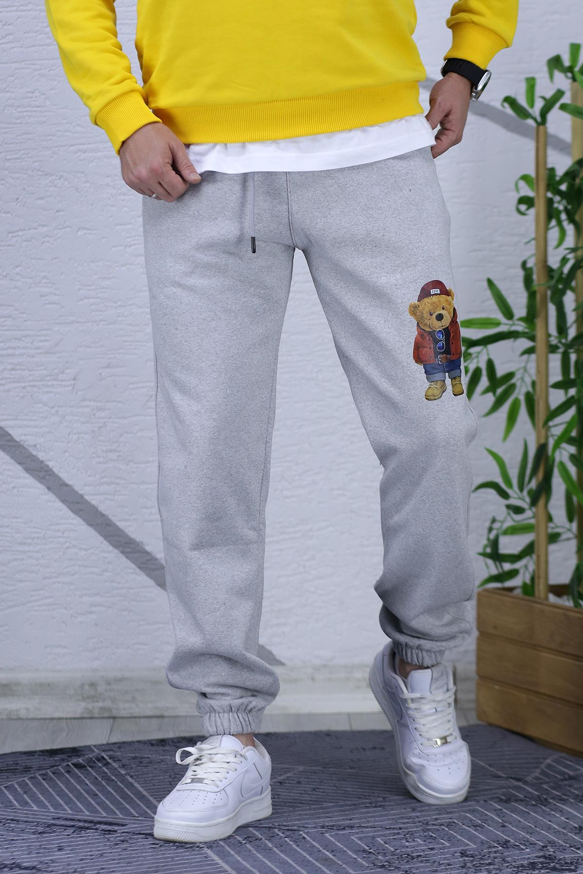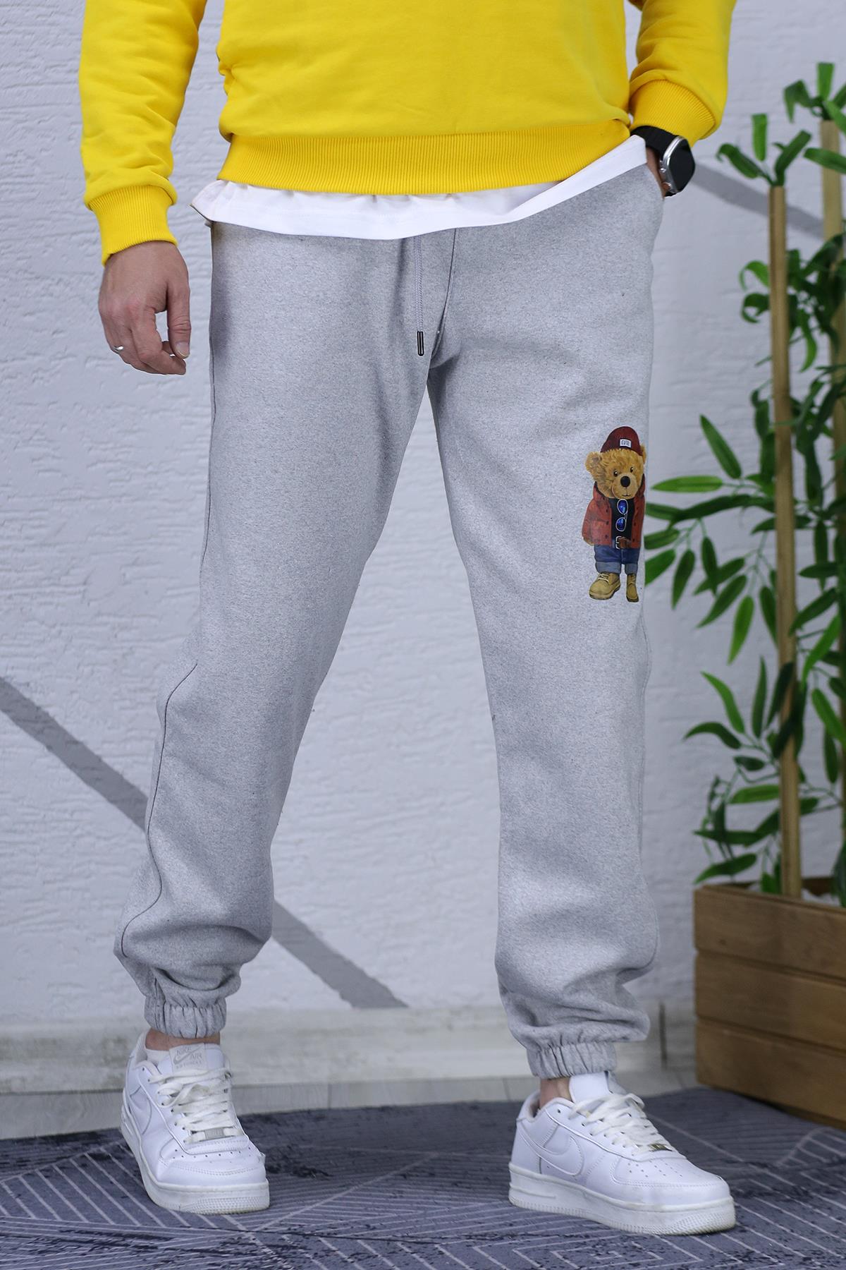 Erkek Şardonlu Üç İplik Ayıcık Baskılı Eşofman Altı - Gri