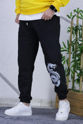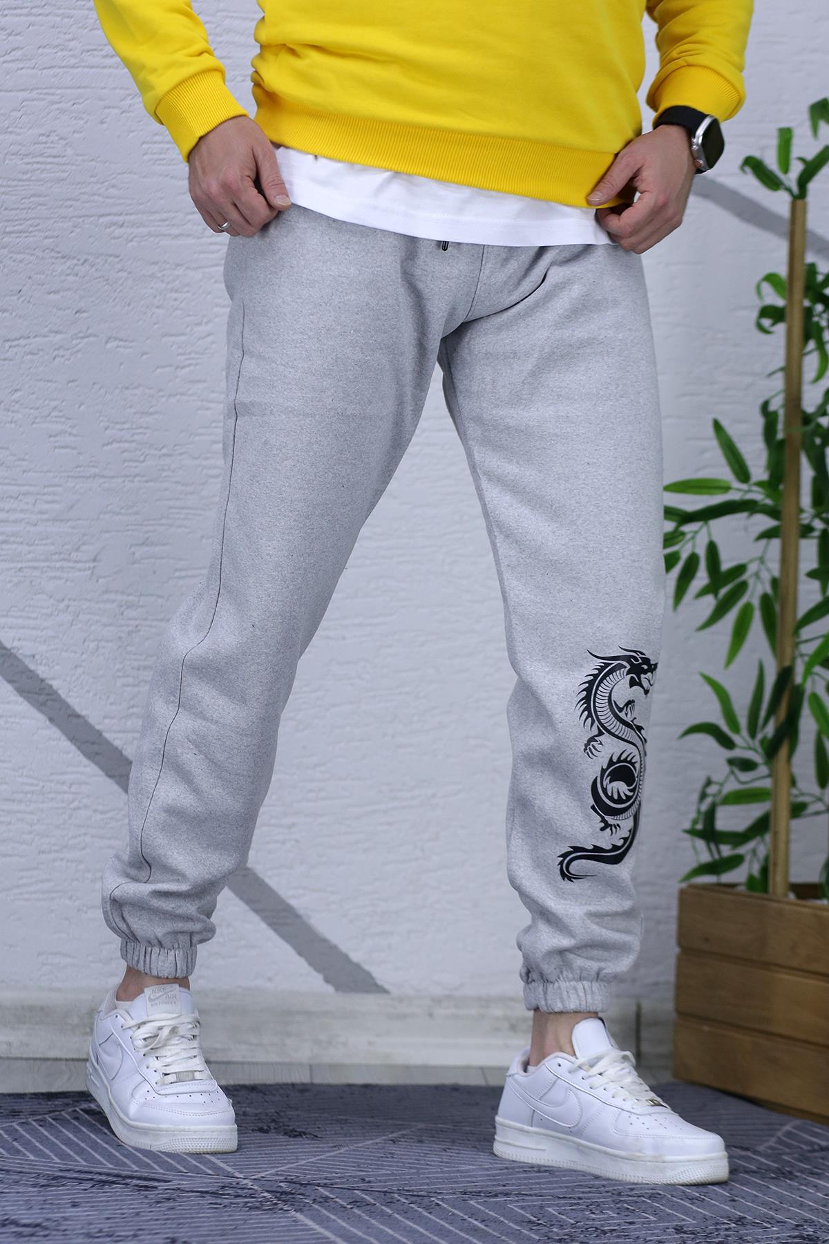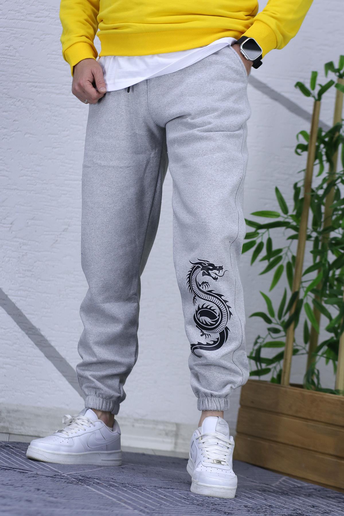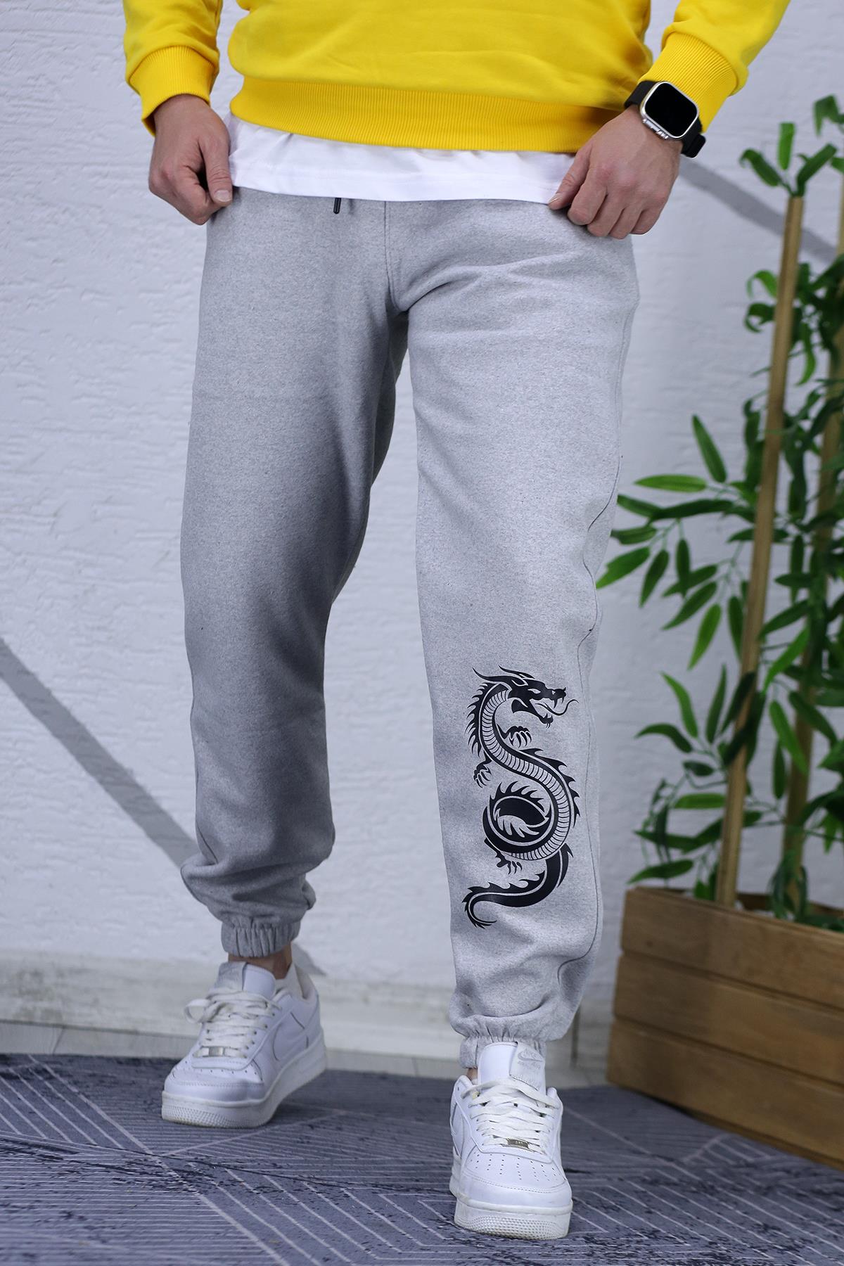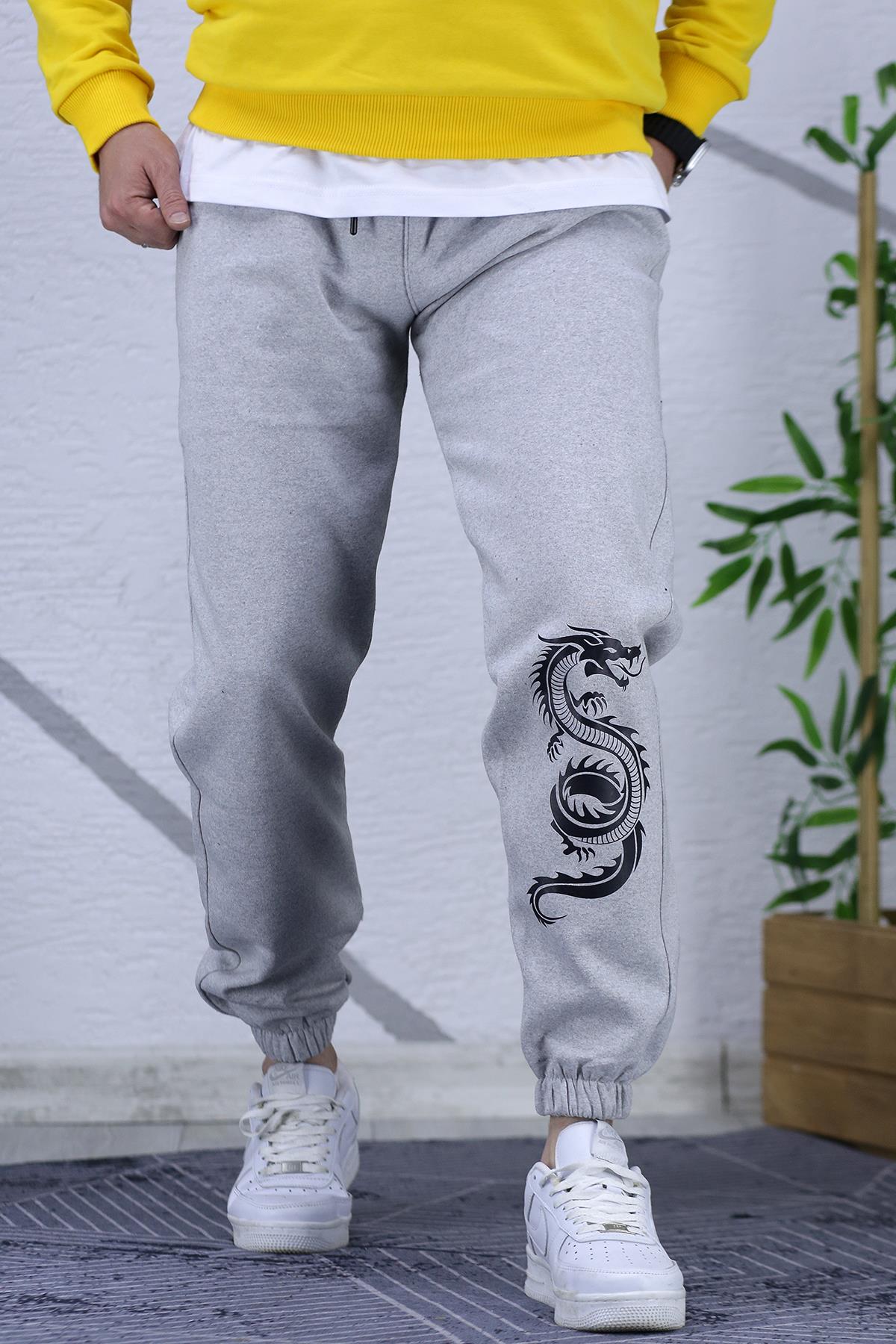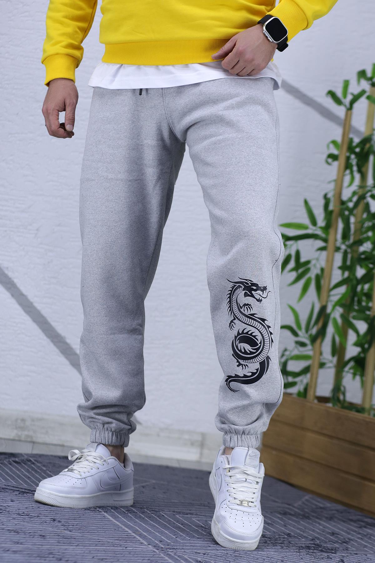 Erkek Üç İplik Şardonlu Dragon Baskılı Eşofman Altı - Gri