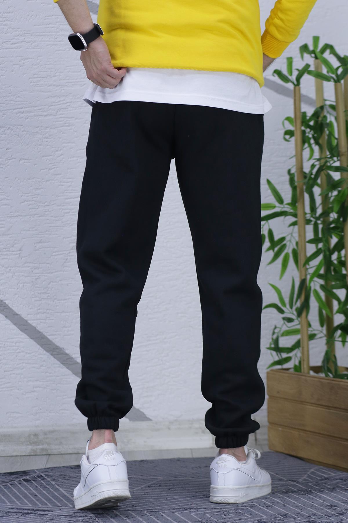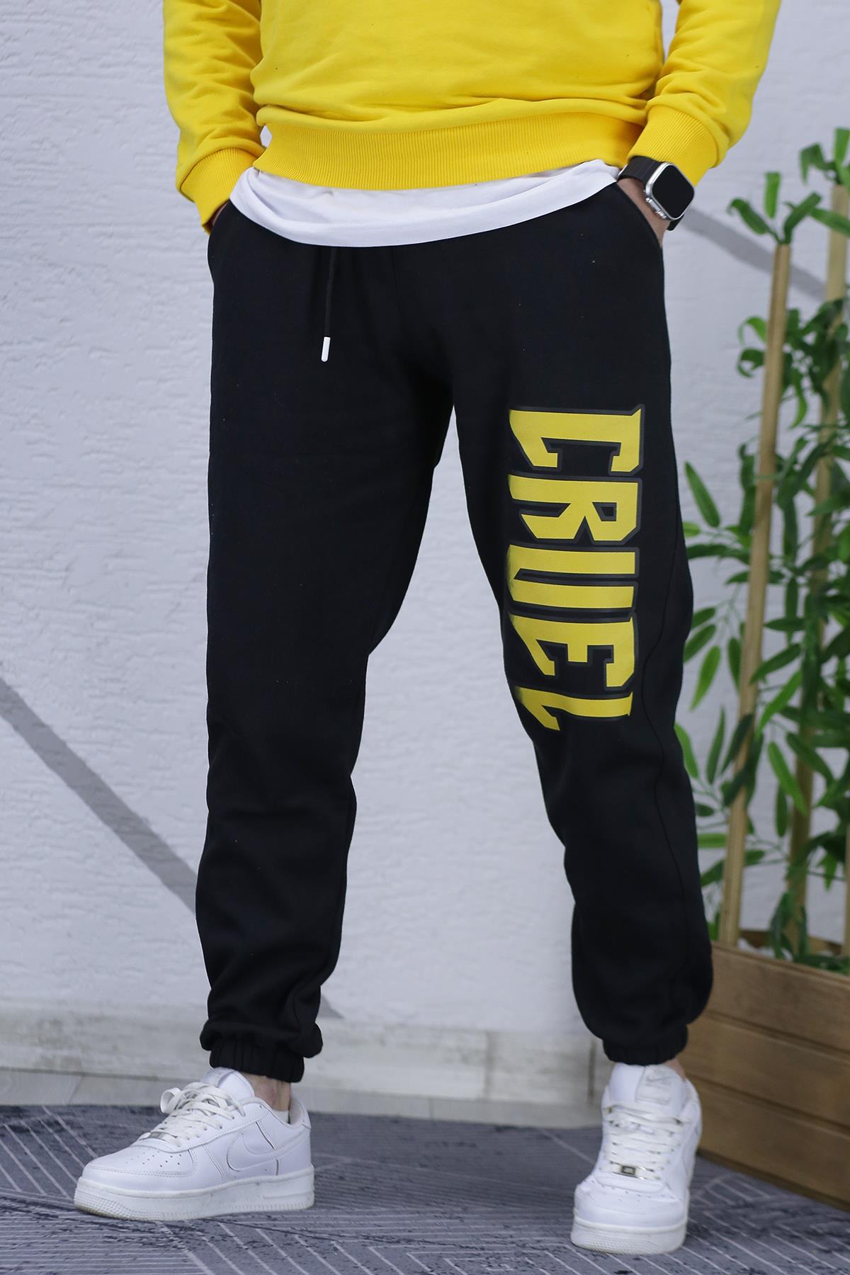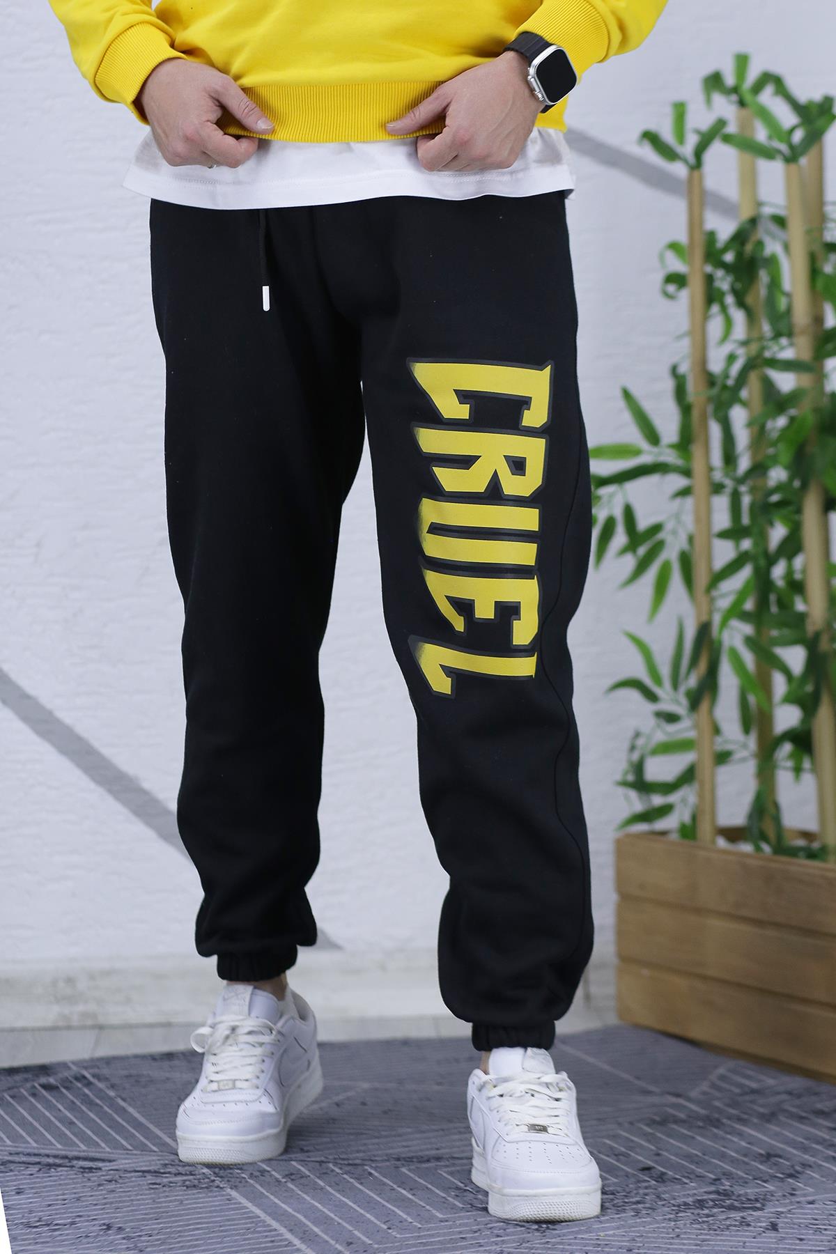 Erkek Üç İplik Şardonlu Eşofman Altı Cruel Baskı - Siyah